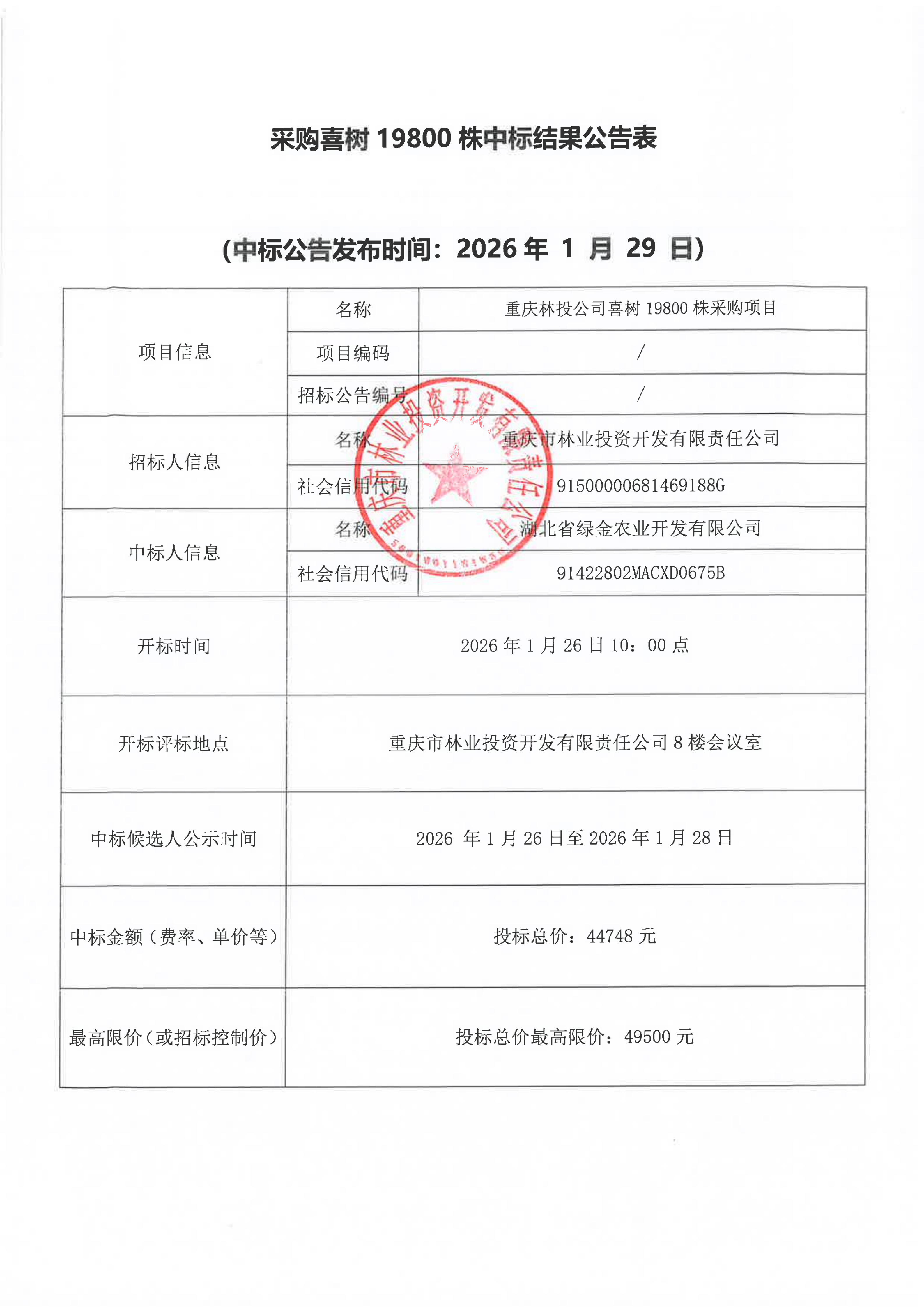 采购喜树19800株中标结果公告
