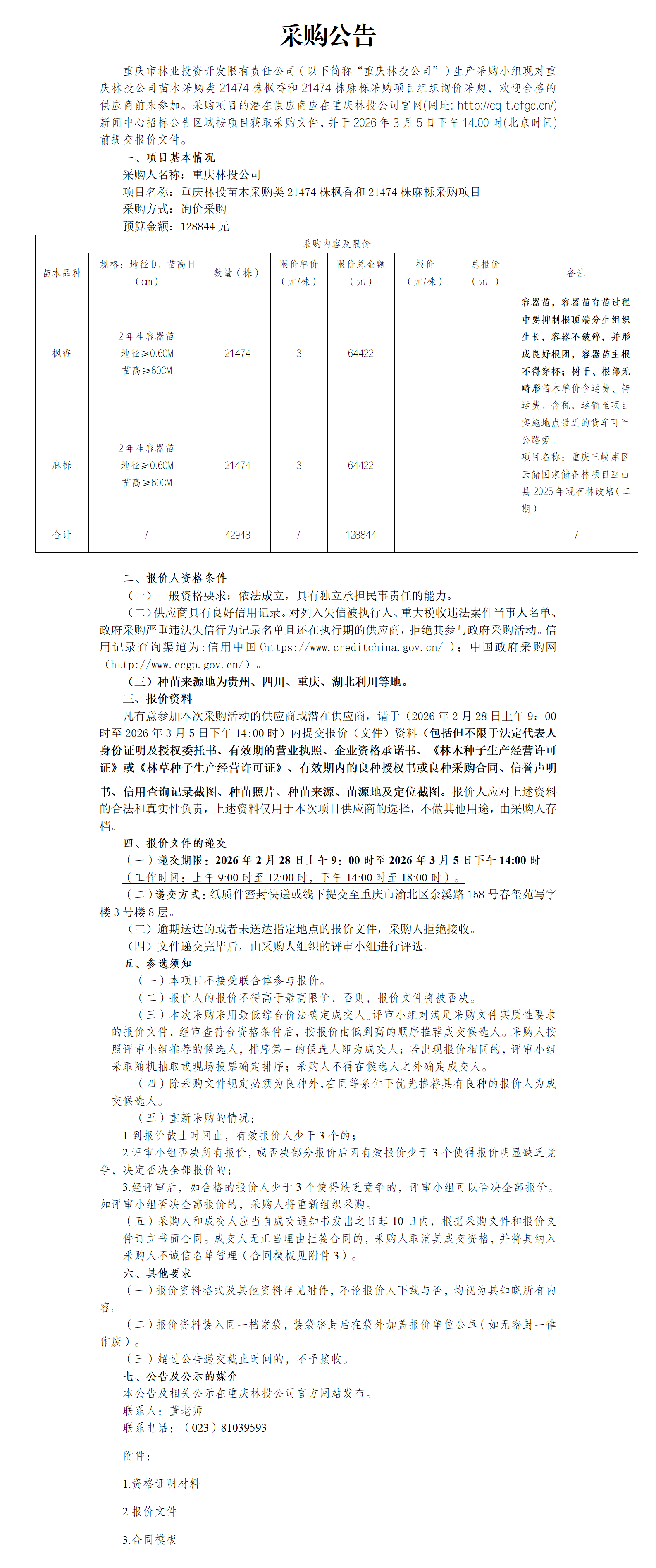 重庆林投苗木采购类21474株枫香和21474株麻栎采购项目采购公告