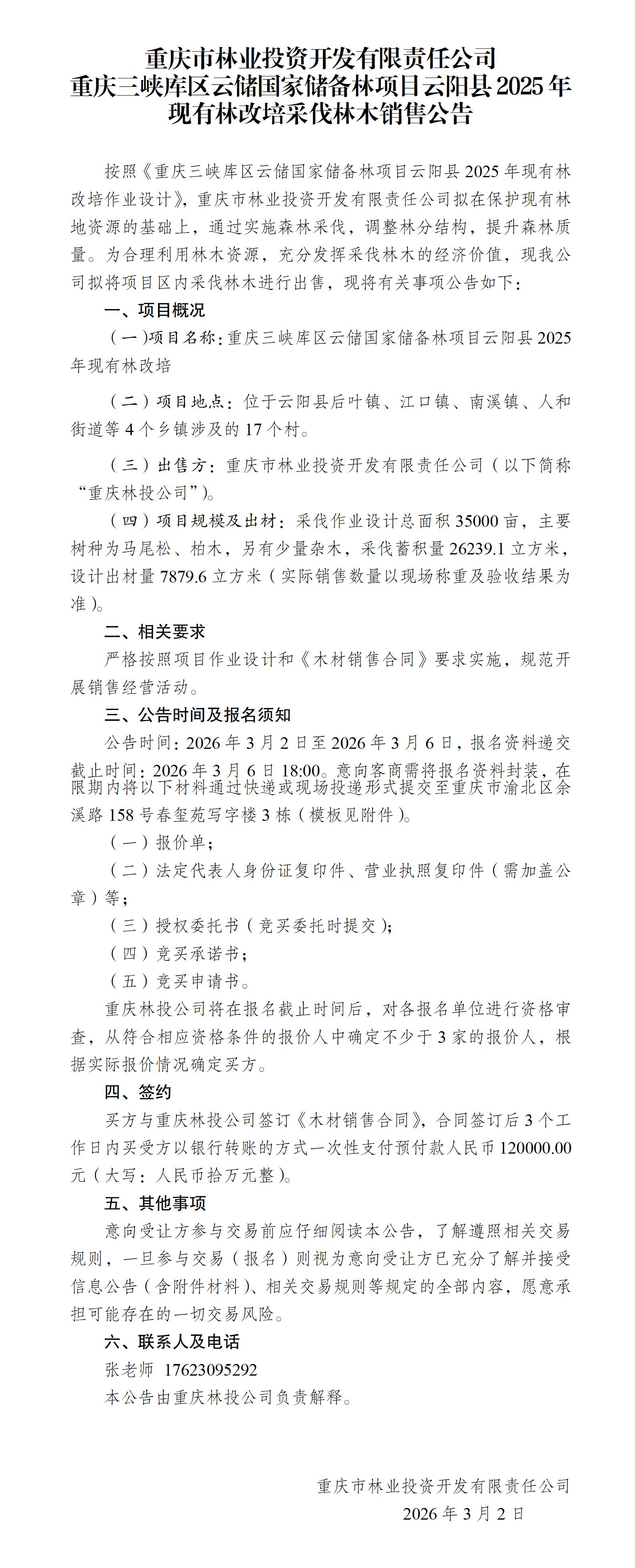 重庆三峡库区云储国家储备林项目云阳县2025年现有林改培采伐林木销售公告