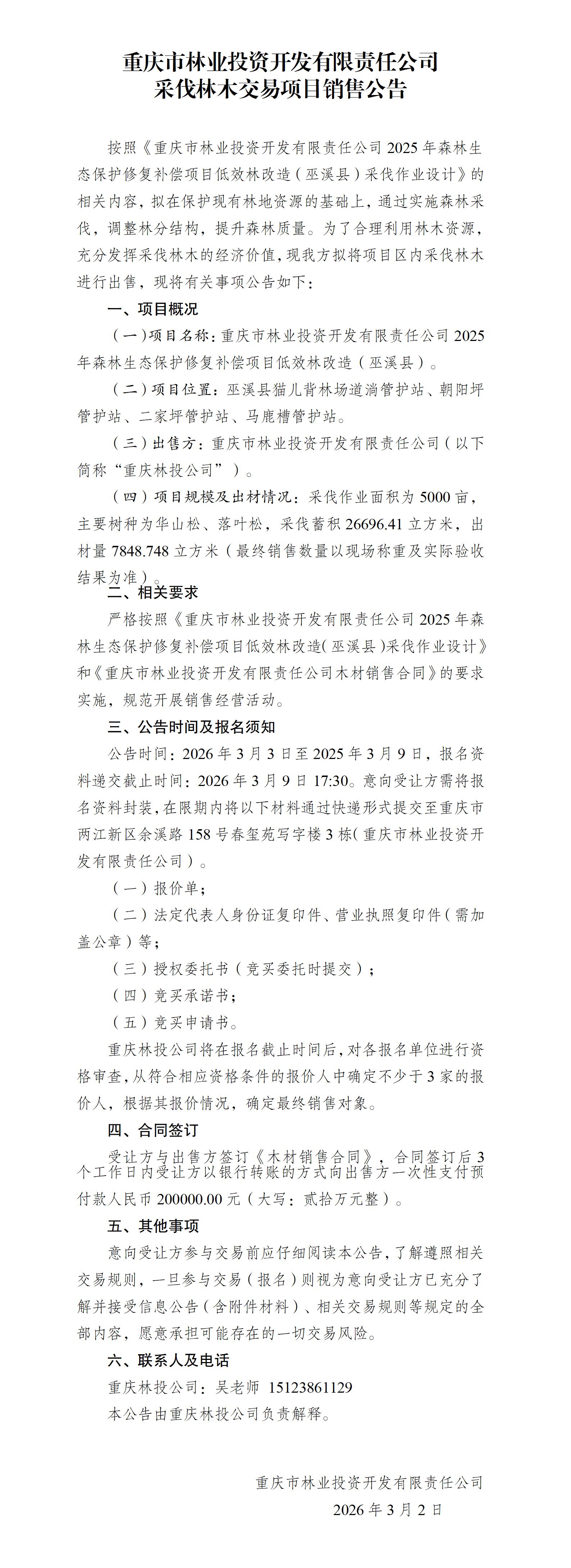 2025年森林生态保护修复补偿项目低效林改造(巫溪县)林木采伐销售公告