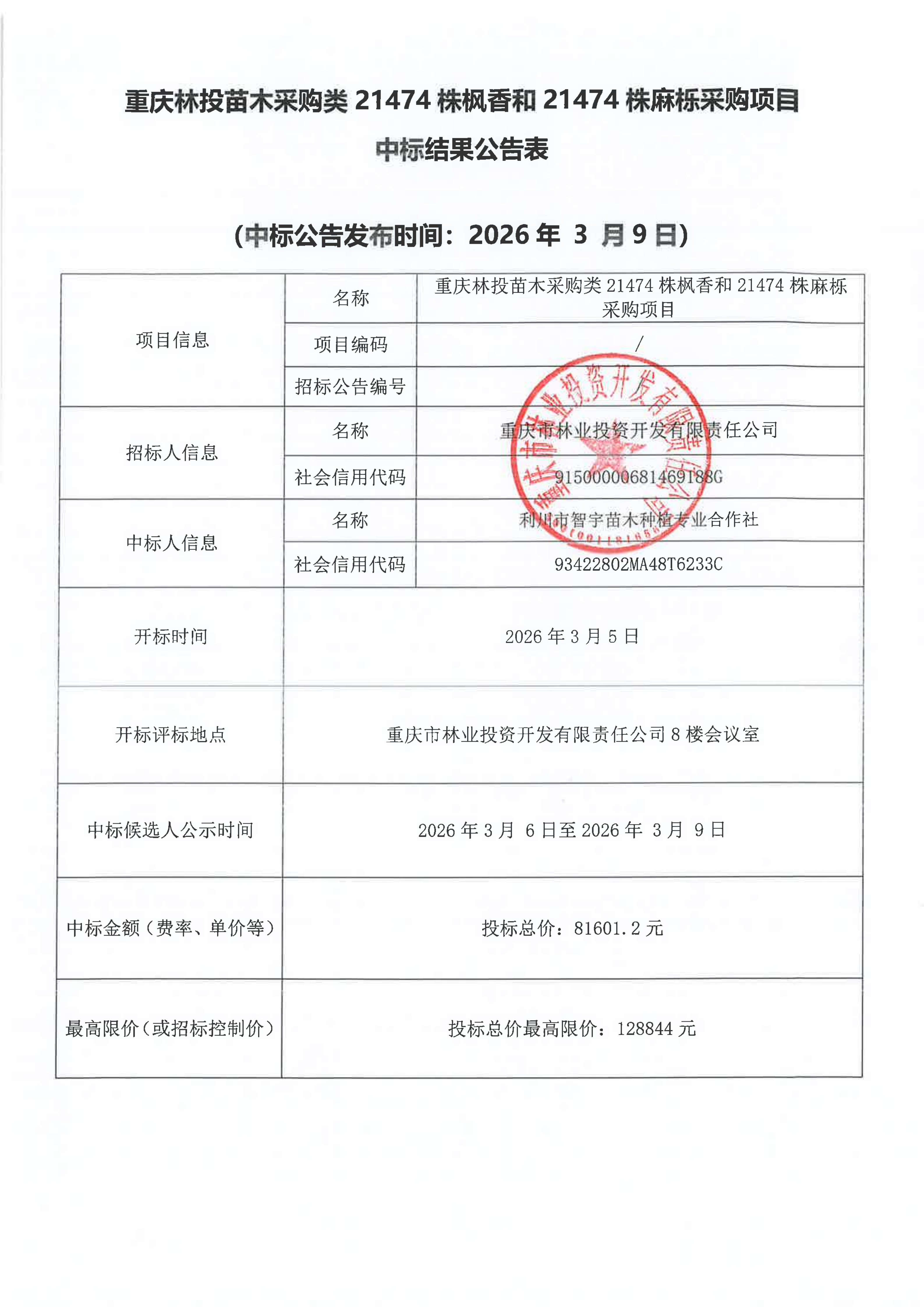 重庆林投苗木采购类21474株枫香和21474株麻栎采购项目中标结果公告