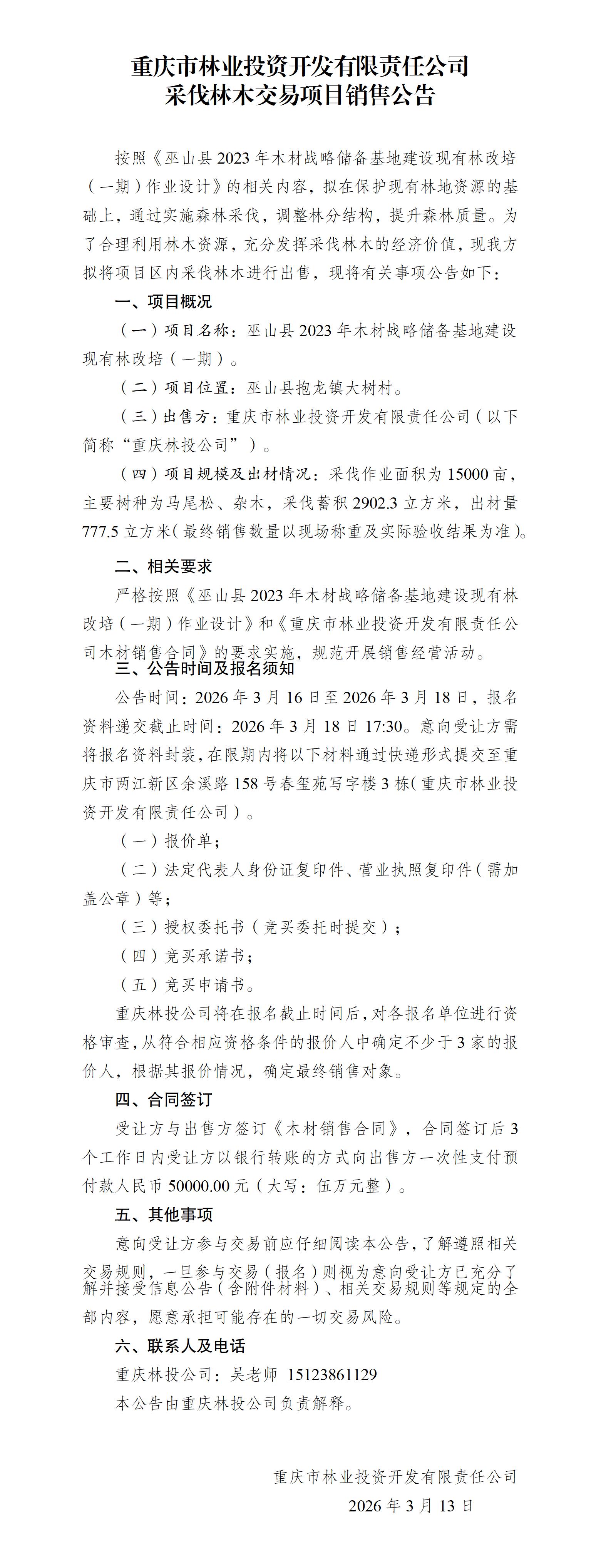 巫山县2023年木材战略储备基地建设现有林改培(一期)林木采伐销售公告