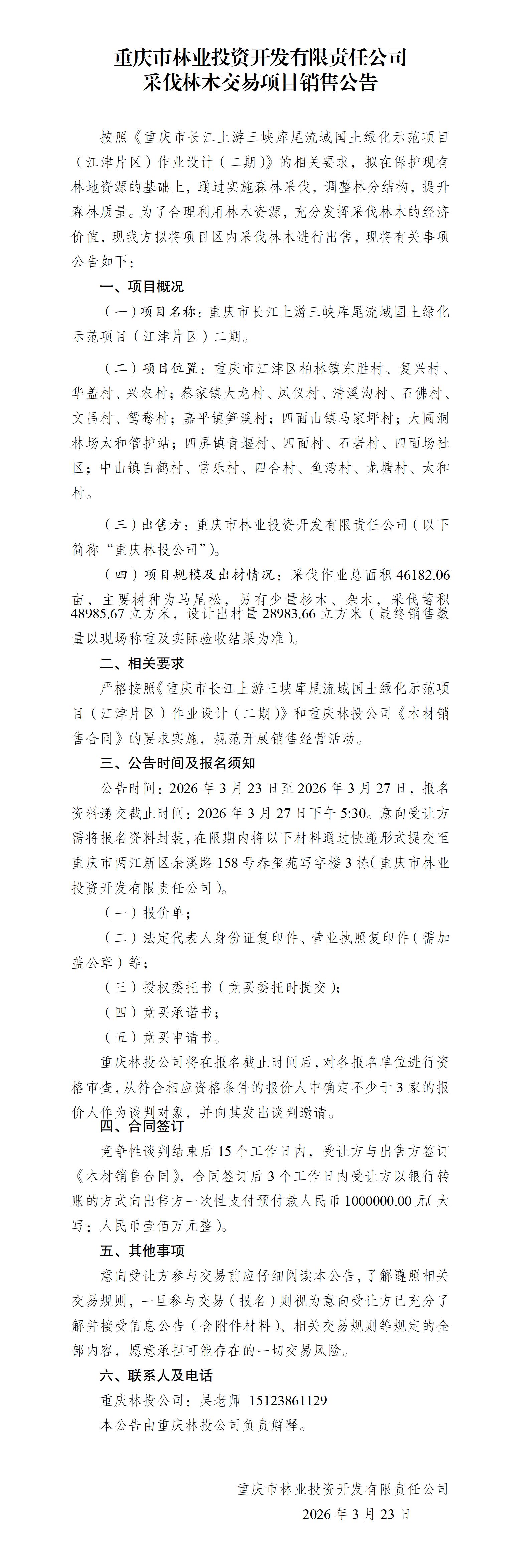 重庆市长江上游三峡库尾流域国土绿化示范项目(江津片区)二期木材销售公告