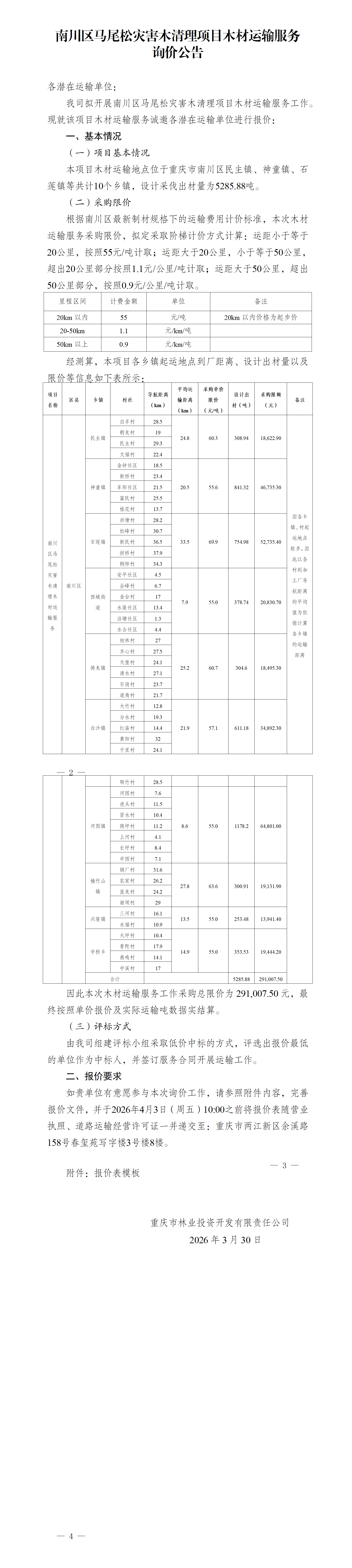 南川区马尾松灾害木清理项目木材运输服务询价公告