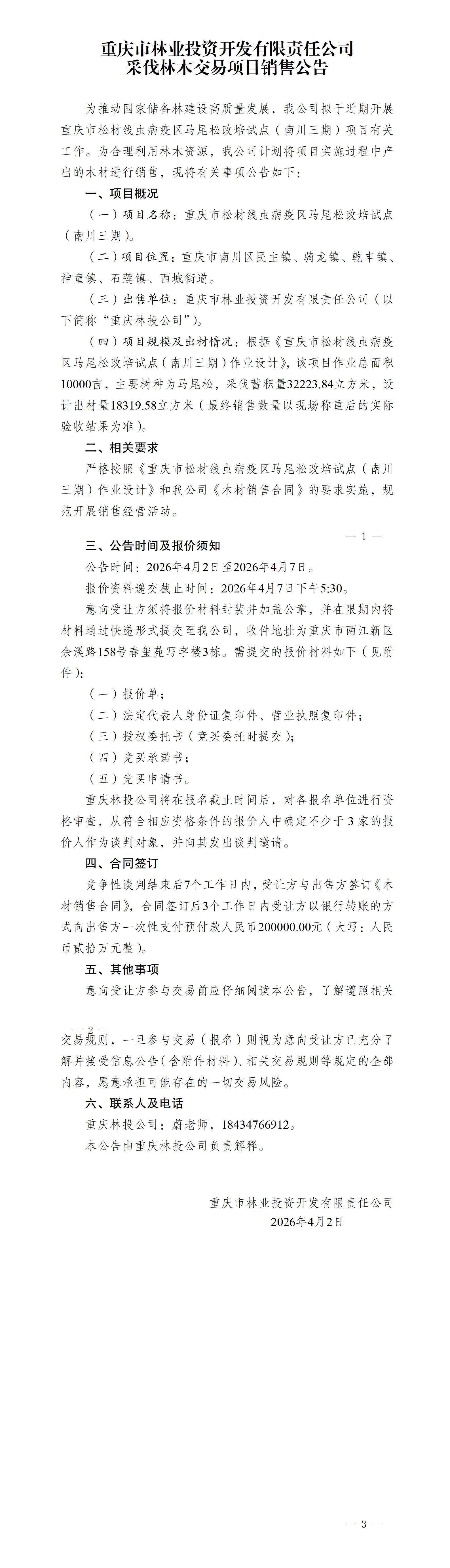 重庆市松材线虫病疫区马尾松改培试点(南川三期)销售公告