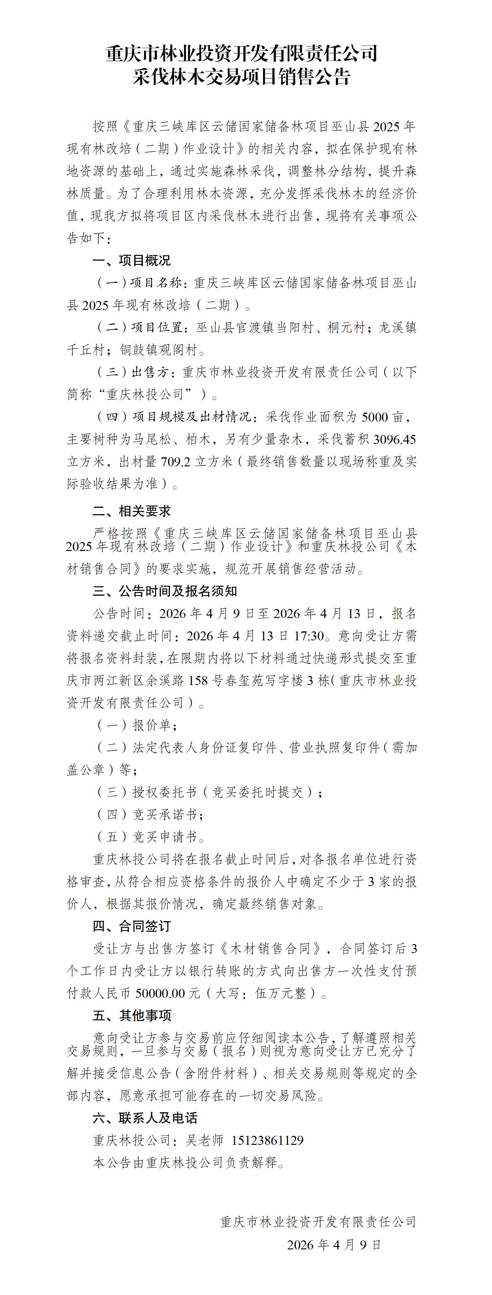 重庆三峡库区云储国家储备林项目巫山县 2025 年现有林改培(二期)采伐林木交易项目销售公告