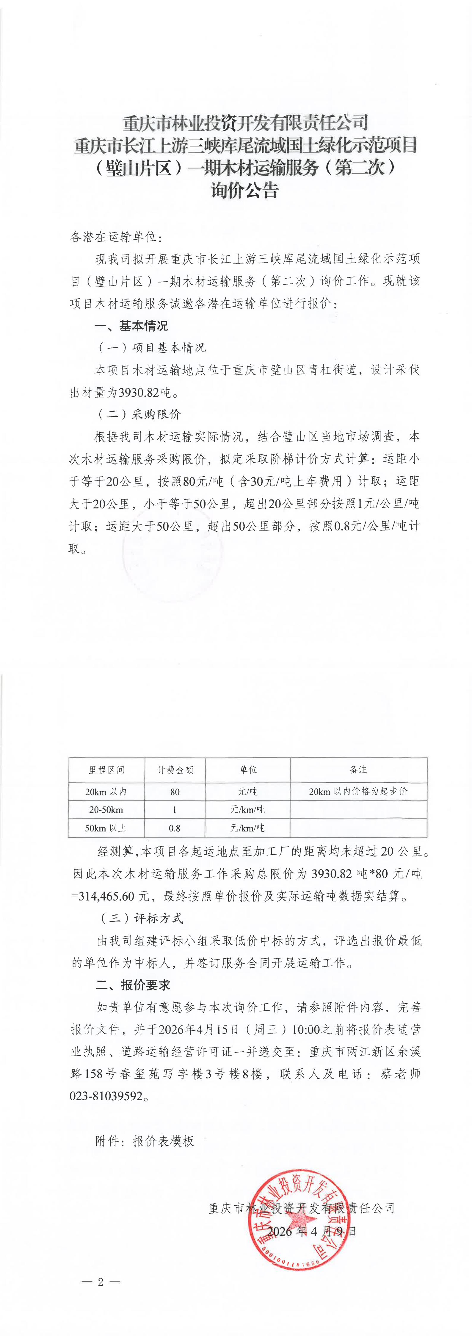 重庆市林业投资开发有限责任公司重庆市长江上游三峡库尾流域国土绿化示范项目(璧山片区)一期木材运输服务(第二次)询价公告