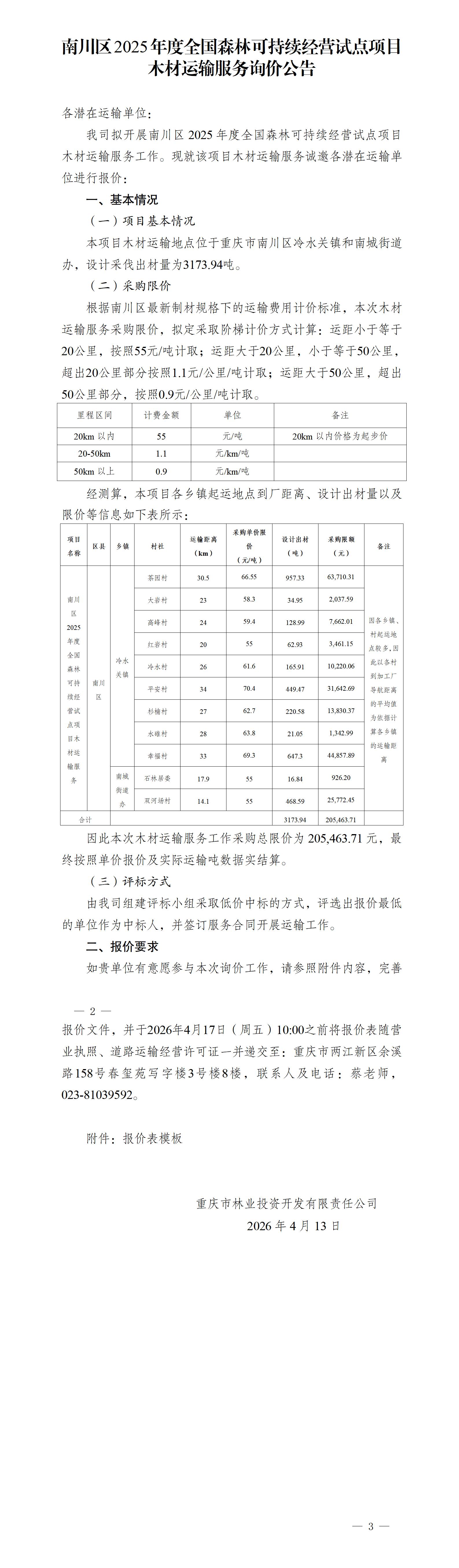 南川区2025年度全国森林可持续经营试点项目木材运输服务询价公告