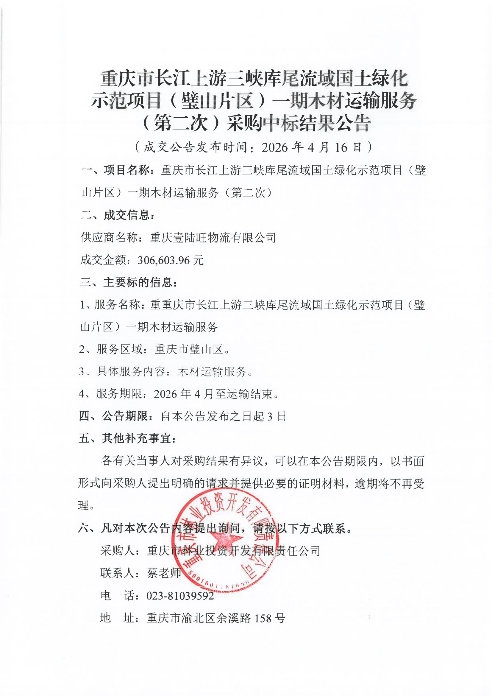 重庆市长江上游三峡库尾流域国土绿化示范项目(璧山片区)一期木材运输服务(第二次)采购中标结果公告
